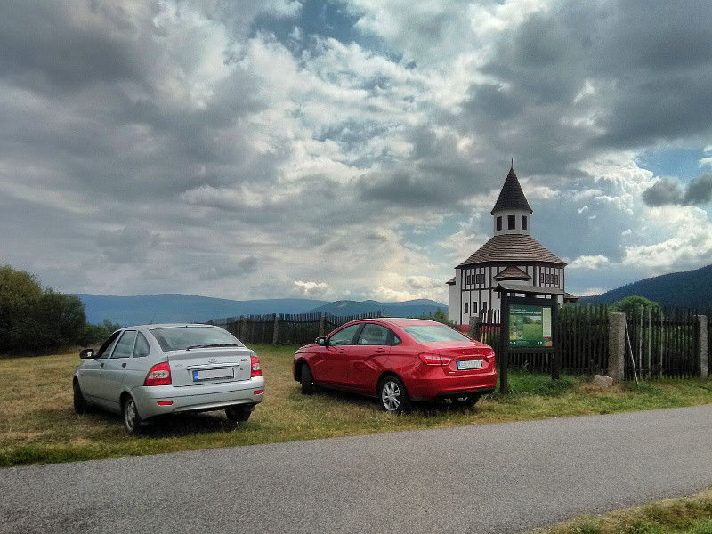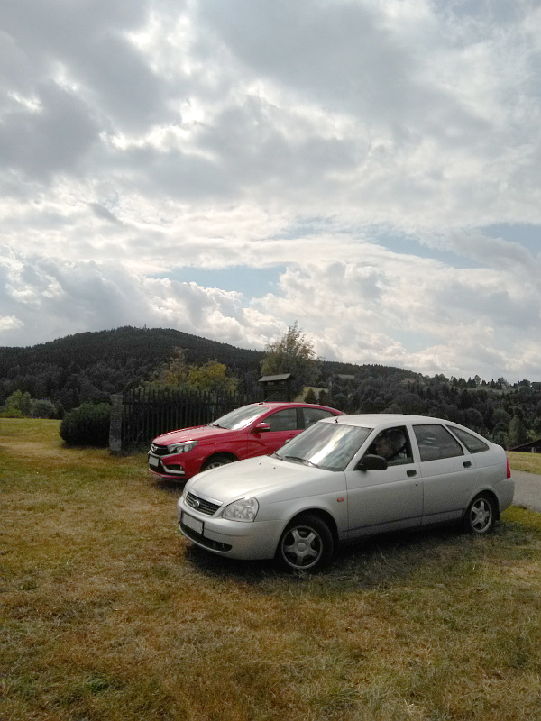 No a pár foteček: Nejprve ukázka, že ani sedanu nevadí parkování v horách u nezpevněné krajnice: výlet na černou studnici (akorát jsem pak nevěřil Waze, který mne poslal přes vrcholovou cestu a objížděl jsem to zbaběle po asfaltce, ale když jsem koukal z druhé strany, tak by to byla Vesta v klidu dala a zákaz tam nebyl (a i po asfaltce se po nás otáčeli):