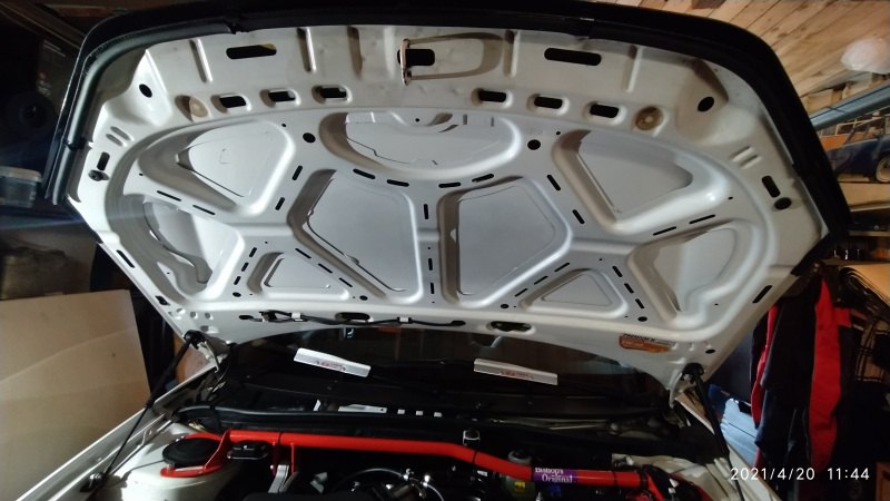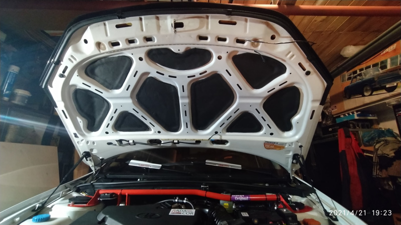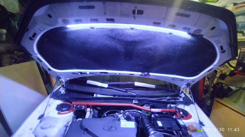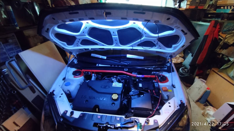 Skoro po dvoch mesiacoch dorazila z Číny samolepiaca šumo-izolácia 5mm hrúbky, tak som mohol pokračovať v ďalších zlepšovacích „projektoch“ s vystriekaním dutín kapoty po jej nalepení. A keď už je pekne osvetlený zavazadlový priestor, tak prečo neosvetliť aj motor pre prípad poruchy s bielou LED v noci a keď nie, tak len tak pre potešenie na modré intimčo.