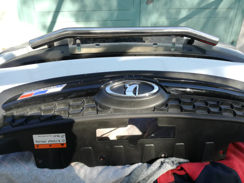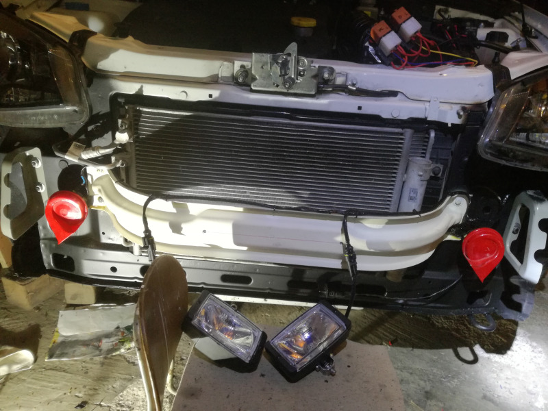 Dostal som sa konečne aj k montáži „усилителя бампера“ pod plastový nárazník a zároveň k inštalácii prídavných diaľkových svetiel s držiakom pod ŠPZ a silných klaksónov „slimákov“ čo mi zostali po „ekologickej likvidácii“ nášho starého vozu Renault 21GTD. Po demontáži nárazníka bolo treba naťahať novú elektrickú kabeláž na napájanie prídavného zariadenia, lebo presne dimenzované tenké kábliky by už zvýšený odber prúdu nezvládli. Pri tom som demaskovanú prednú časť preventívne prestriekal Dinitrom a ML-kom všade, kde som sa vedel dostať.