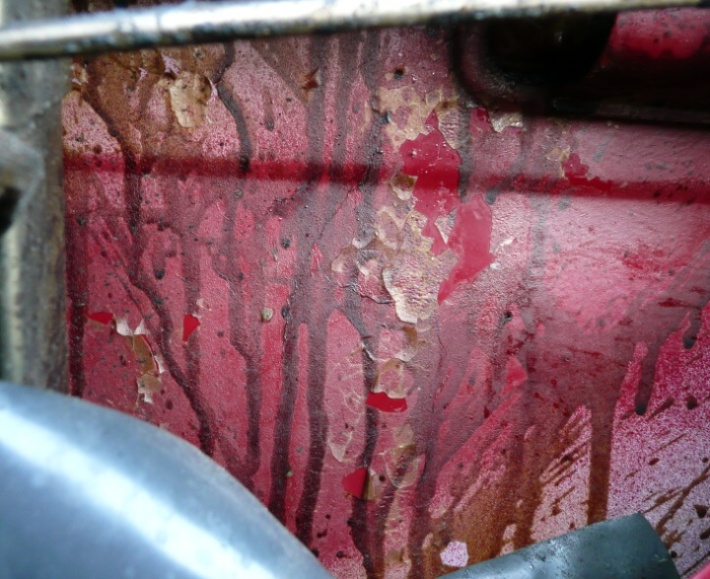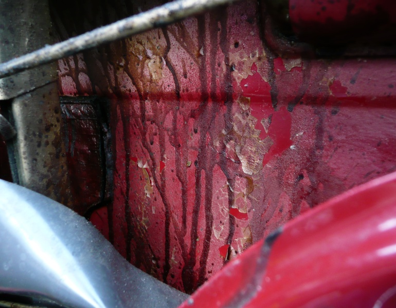S jistotou vím, že tmavý (černý) stékající části je recept, který používám je směs tlumex na spodky - olej - petrolej, jak jsem tady popisoval. Tvrdou slupkou se petrolej nepropil, protože by to nemohlo popraskat, ale spíš by to mohlo maximálně vyměknout. Ale v popraskaný části není ani přeteklý tlumexovou směsí. Každopádně, mikrotrhlinky v "profesionálním" výrobku musely být už před mnoha mnoha lety, když má tolik prasklin a samovolně odpadává. Netvrdím, že byl nástřik úplně na nic. Konečně mohu předvést, že má profesionální nástřik výrazně kratší trvanlivost, než téměř stejně starý vlastní nástřik receptury s petrolejem, vybádaným v českém výzkumném ústavu. Jak asi vypadají současné vosky, když je vysuší sluníčko......