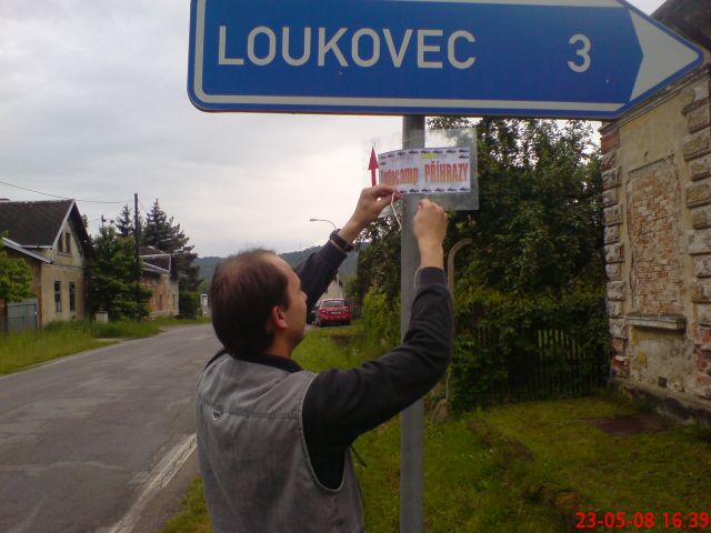 Cedule je pěkná, ale já si na krásu moc nepotrpim, tak bych spíš dal přednost čitelnosti. Přecijen ta žlutá na bílym mi dělá obtíže. Já osobně bych volil černý nápis psaný VELKÝMI písmeny bez jakýchkoli obrázků, natož aby ty obrázky zasahovaly do textu, nebo se textu dotýkaly. Je to zase na úkor čitelnosti. Ale samozřejmě budu rád za jakékoliv cedule, které pomohou účastníkům pohodlněji nalézt místo srazu. Já osobně tam trefim i bez cedulí.