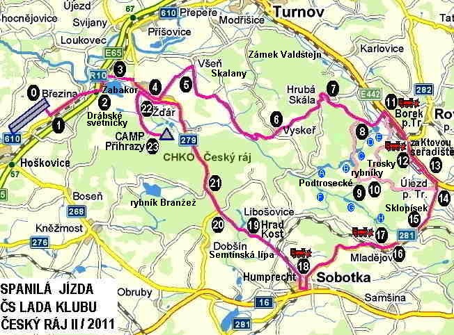2) Nová trasa 45 km - Vyskeř, Hrubá Skála, okolo těch dvou rybníků, písák Střeleč, přehlídka v Sobotce + zámek Humprecht a hrad Kost . Tady je opět problém – dva okresy Jičín a Semily (jestli s tím měla loni policie problémy, tak letos asi budou mít ještě větší). A sobotecké náměstí je o něco menší než turnovské. Je zde však minimální provoz.