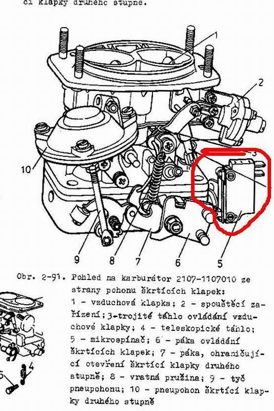 Jedná se o karburátor DAAZ OZON 2107 (pravděpodobně). Mikrospínač řídí ekonomizér, což je přídavný systém karburátoru pro uzavírání volnoběhového kanálu při deceleraci. Pokud mikrospínač je vadný nebo nesprávně seřízený, může to volnoběh a vlastně i běžnou jízdu dost zásadně ovlivňovat.