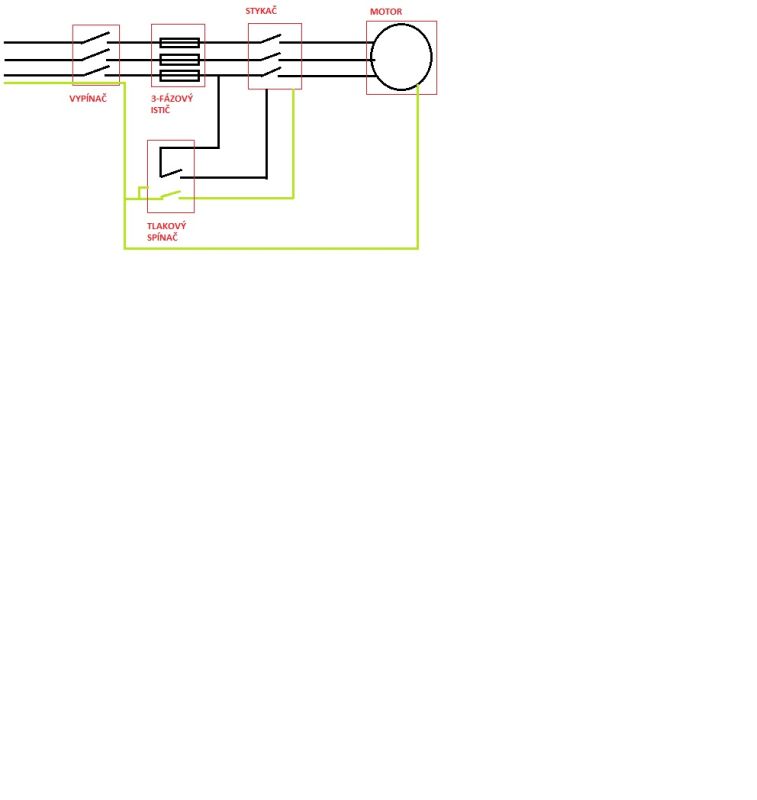 Mezi stykač a vypínač by bylo opravdu dobré zařadit třífázový jistič. Nejlépe řekněme 4A/3P/C. (C je tvrdší charakteristika, tak unese i rozběhy do tlaku)
