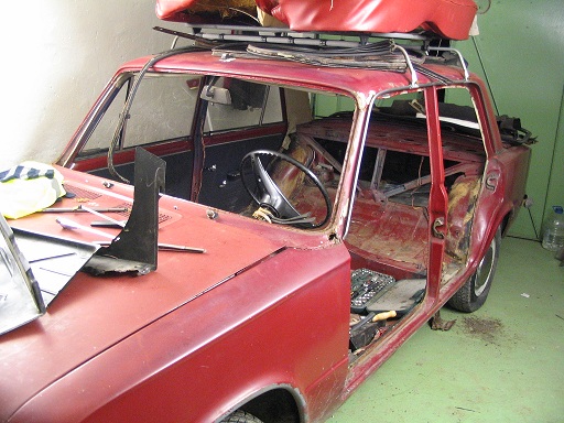 Pri zbežnej obhliadke je podlaha OK, ale predná časť, roh na vodičovej strane je totálne na šrot, chytená je aj prepážka. Zdá sa, že zatekalo okolo okna a celá tá strana od rohu okna dole bude úplne zhnitá. Rovnako aj vnútorný prah. Výstuha prahu od blatníka niekam zmizla. Minimálne jedna kapsa pred zadným blatníkom sa bude tiež operovať. Strana spolujazca je na tom o čosi lepšie, pravda sa ale ukáže, až keď odstránim gumoasfalt čo tam svojho času otec dal.