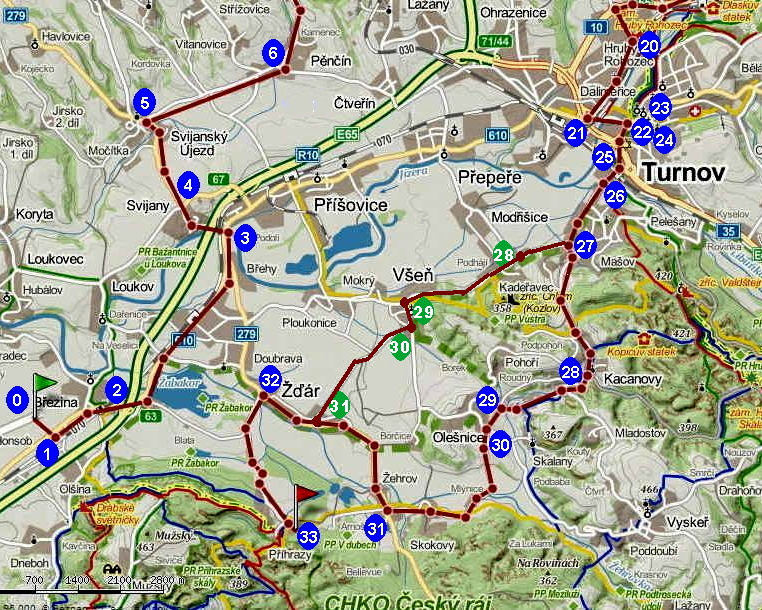 Itinerář původní (čísla v modrém kroužku) a o 5 km zkrácené trasy (čísla 28, 29, 30 a 31 v zeleném kroužku ).