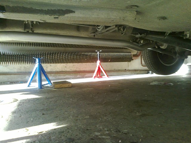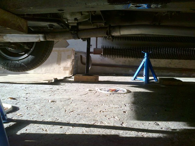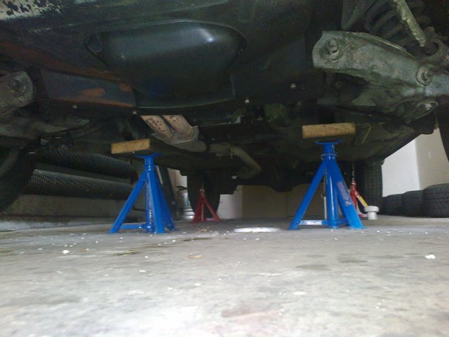 Vzadu davam na ty kostky na karoserii, vepredu pod napravnici. Protoze je podpera kovova, koupil jsem takovou ctvercovou gumovou podlozku pod pracku, narezal na 4 kusy a davam to pod to.