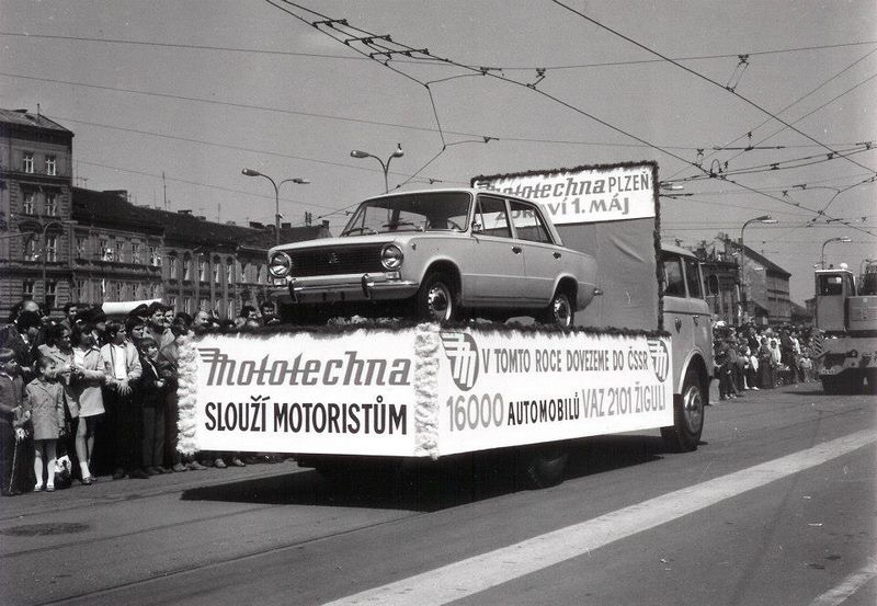 Ta chromovaná poklice na trambusu je krásná... A už vidím dnešní alegorický vůz CS Autolady. V letošním roce dovezeme 16 automobilů značky Lada.