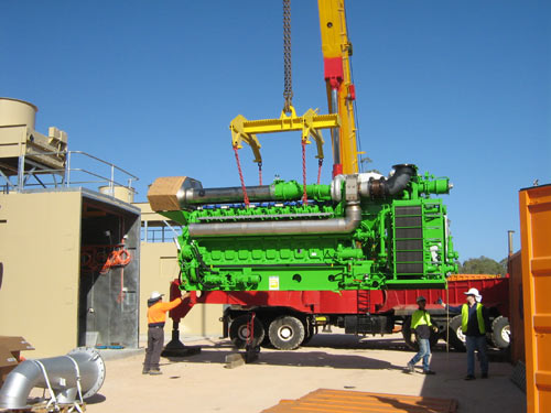 2. Dvacetiválcový motor se dvěma turbodmychadly (pravděpodobně J620) kogenerační jednotky Jenbacher bez generátoru (pouze vlastní motor) při skládání z valníku. Lze porovnat velikost s lidmi kolem. Vpravo je pěkně vidět výměník voda-voda, který z vnitřního (malého) okruhu chlazení motoru předává teplo do velkého okruhu a stolových chladičů.
