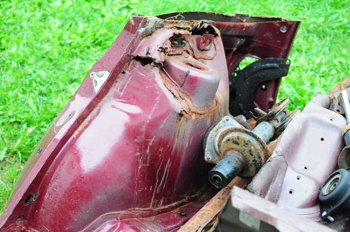 Na zelené, která byla korozí netknutá jsou v pravým prahu díry, při přezouvání se letos dal práh do pohybu, hezky zakřupal a lehce se vytvaroval, ale opět jen u pravého předního kola. Koukal jsem na hrnce, taky se to pěkně barví do hněda, ale naskrz to zatím není. Zub času zahlodal.