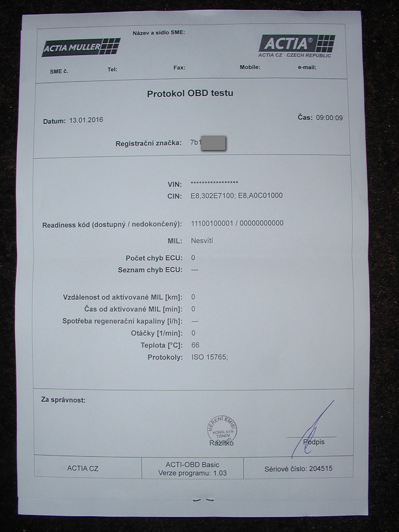 Zajímavé je, že na protokolu VIN není zapsáno, diagnostika jej však vyčetla. Vyčetla i spoustu dalších informací, test probíhal cca 2min., následovalo klasické měření emisí (přes stejný počítač, s připojenou diagnostikou). V protokolu o měření emisí je však pouze klasický zápis z průběhu měření a tento holý protokol z diagnostiky: