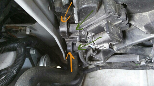 Na priloženej fotke sú žltými šipkami znázornené ušká na chladiči a zelenými šipkami teleso ventilátora nasunuté do tých ušiek.Dostanete sa k tomu len po demontáži komplet vzduchového filtra."Opravil" som to klasickým spôsobom,zastrúhal som trocha bukového :D a zapichol som ho tam.Ak by sa vám teda pri chode ventilátora objavili vybrácie,možná príčina je táto :) .