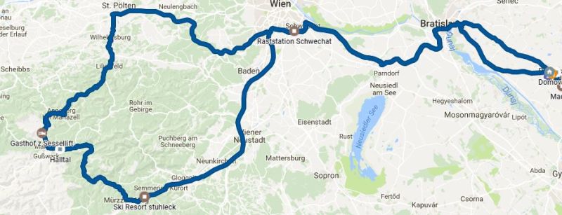 z minuleho vikendu nam zostala platna 10 dnova rakuska dialnicna znamka. Takze som koncom tyzdna googlil, kde sa da povozit po Alpach. Stranku si uz nepamatam, ale nasiel som na nej priblizne tuto trasu, ktoru sme dnes absolvovali: Po dialniciach sme sa dostali az do lyziarskeho strediska Stuhleck, odkial sme uz pokracovali po okreskach. Dostali sme sa v polke cesty do lyziarskeho strediska v Mitterbach am Erlaufsee, kde sme si dali neskorsi obed: Potom sme pokracovali smerom na sever. Cesty boli vacsinou suche, teplota bola tesne okolo nuly. Scenerie boli uzasne, ale bol som sam s detmi, tak nemal kto za jazdy fotit a z miest kde sa dalo zastavit uz take pekne vyhlady neboli. Serpentin a klesani a stupani bolo dostatok.