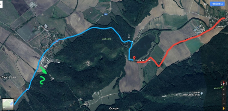 Prijazdova trasa - cervena ciara (modra je Liftback-ov nie uplne presny navrh, kvoli neprejazdnej hradzi. Aspon myslim, ze hradza je uzavreta z oboch stran rampami)