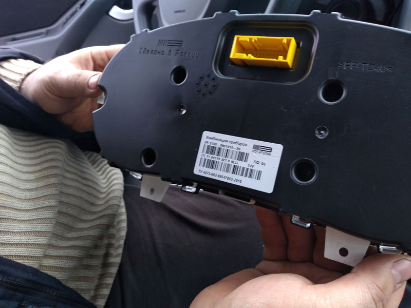 Na dvore som spoznal Prioru a zaparkoval vedľa nej, dali sme sa na vyťahovanie prístrojovky, najprv dole poistkový kryt pri vodičových nohách, pod ním je jedna samorezka, ďalšie držali kryt prístrojovky odspodu, potom ešte nás trošku potrápila zaseknutá, tuším protiprachová koženka napravo od volantu. Štvorica ďalších samoreziek už drží samotný prístrojový panel, po ich odstránení uvolní posledná vec - žltý konektor ktorý ma čiernu postku - je potrebné ho zatlačiť od spínača a šoféra na pravú stranu k spolujazdcovi, potom už prístrojovka ide vonku.