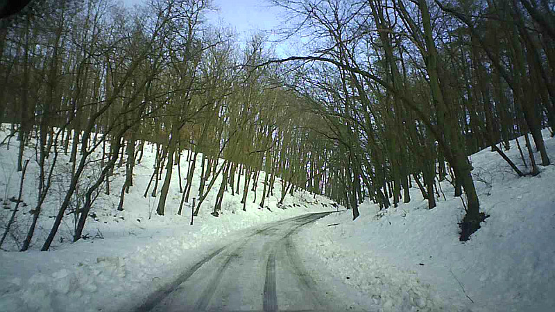bez zaváhání bez použití řetězů (které ale zbaběle ležely vzadu na zemi v pohotovosti) se vyhoupne na zasněžený a lehce zledovatělý Brdský kopec (ne, v místě zákazu nebyl opravdu žádný sníh a nikdo do zákazu nikde nevjel, fotografie je digitálně upravena a nelze ji použít v přestupkovém řízení)
