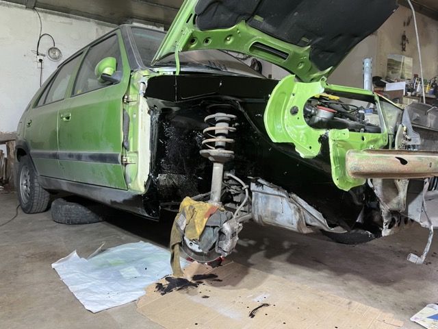 Po výměně těsnění výfuku mezi svody a prvním dílem = citelný nárust výkonu (provozní otáčky asi o 500 méně), výměna filtru vzduchu, ladění směsi LPG, výměna předních světel za origo HELLA, řazení vyměněno za trochu jeté z červené bouračky = zatím bez jízdní zkoušky, ale na místě daleko lepší, jak nové. Z důvodu STK měněn přední blatník s výztuhou a vyvaření podběhu pod ním. Zároveň mám za sebou své první domácí lakování - hodně much/smetí, ale jinak překvapivě pěkné. Příště musím lépe připravit okolí a nedělat začátečnické chyby. Zbývá to složit, vyřešit stahovačky oken a pojede se na STK.