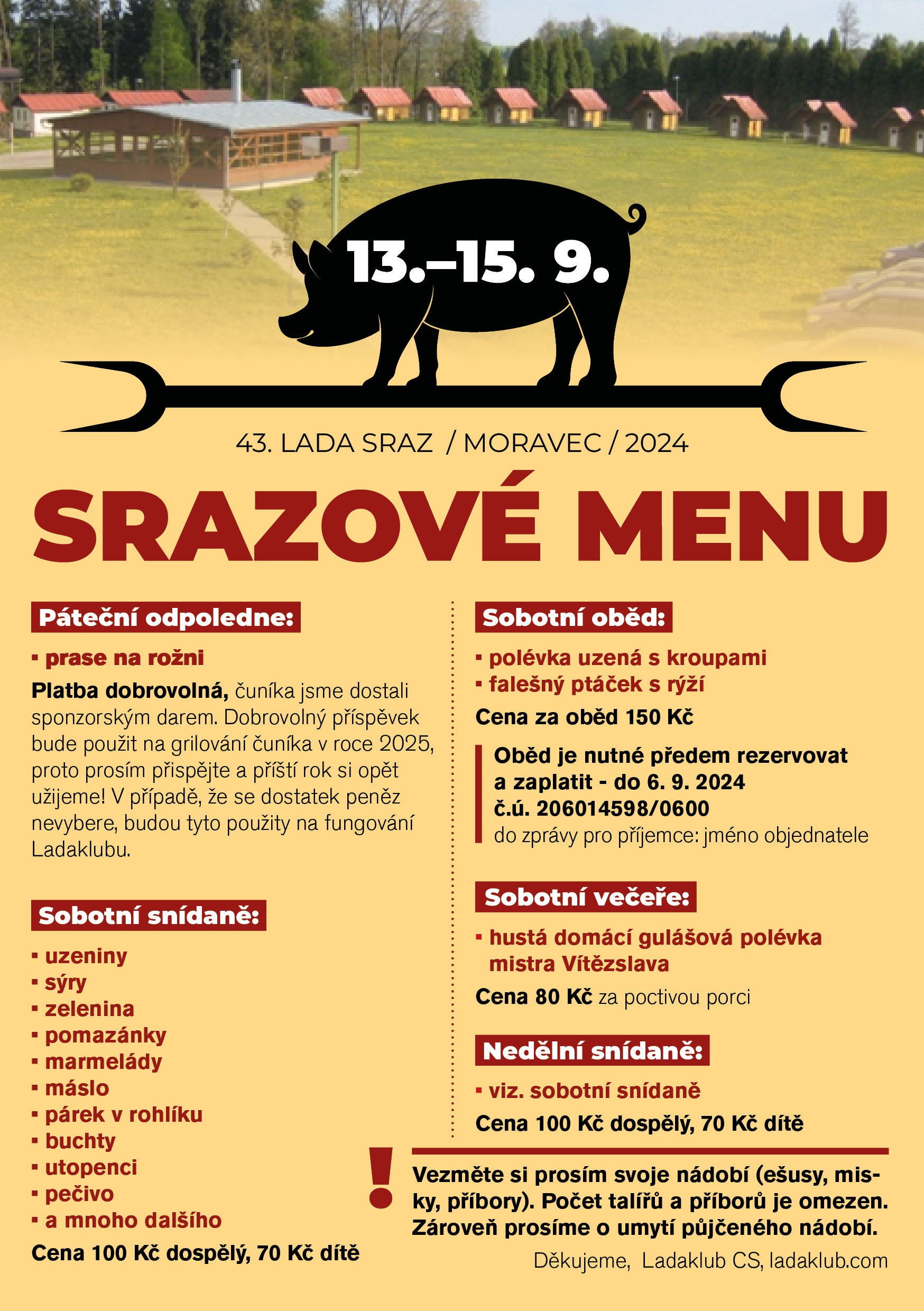 Idem, som zvedavý koľkokrát po ceste chytím zlé počasieVašátor píše: stř zář 11, 2024 17:09 Milí Ladaklubáci a příznivci vozidel Lada. Zaznamenávám vaše znepokojení nad hlášenou předpovědí počasí. Ano, vypadá to, že nám letos počasí přát nebude. Bude zima, déšť i vítr. Bude to úplně jiný sraz, než na jaký jsme byli doposud zvyklí. Na druhou stranu, bude to něco, co jsme možná ještě nezažili a není důvod, proč si to spolu i tak pořádně neužít. My organizátoři jsme si hlášené nepřízni počasí vědomi. Nespíme na vavřínech, makáme, voláme, zařizujeme, vymýšlíme. I tak je nám ale jasné, že dlouho plánovaný koncept srazu během dvou dnů překopat nebude jednoduché. Plány jsou, do jaké míry se nám to podaří, zhodnotíte až vy, účastníci srazu. Nebojte se počasí a přijeďte!
