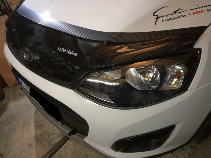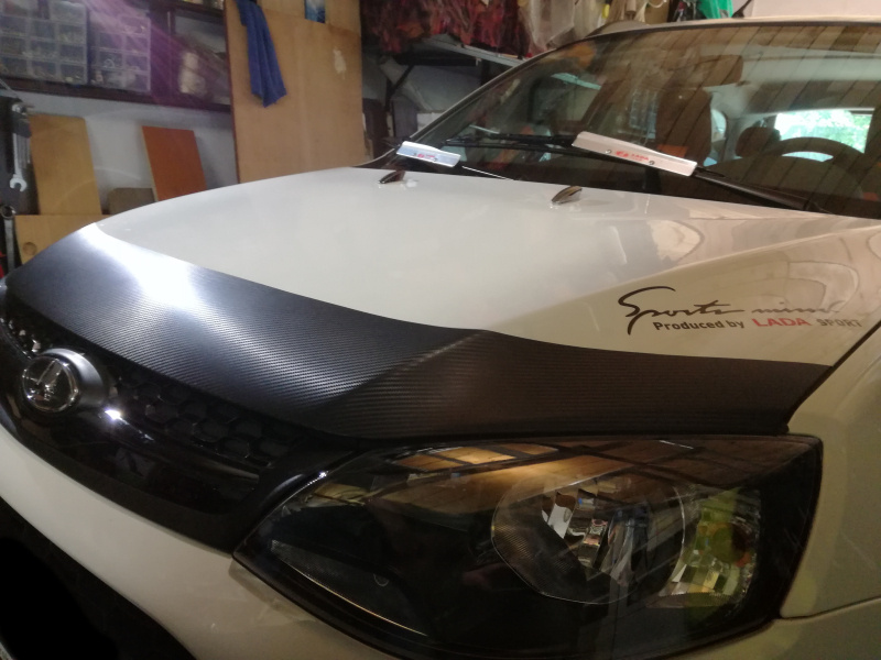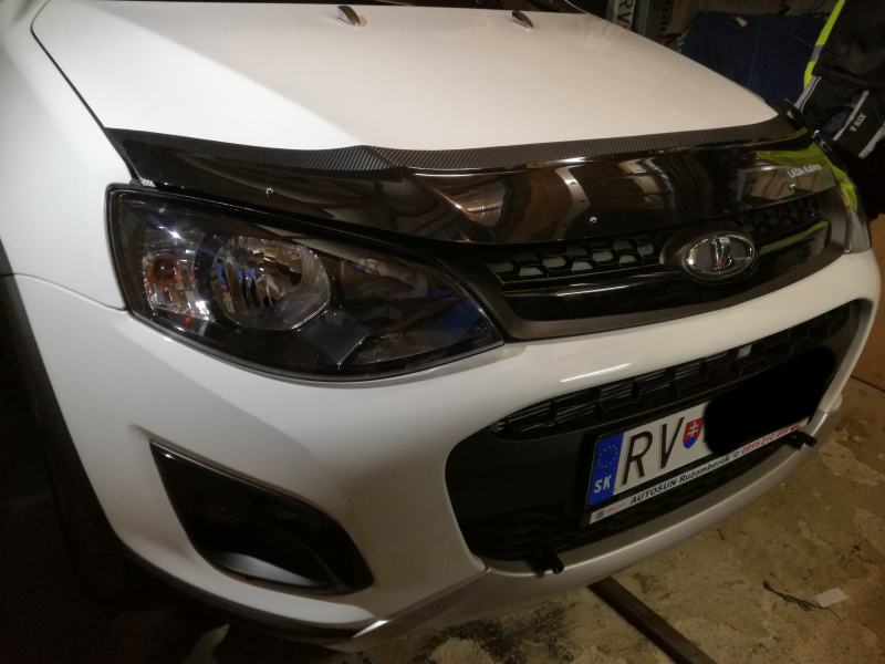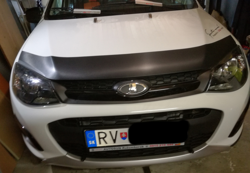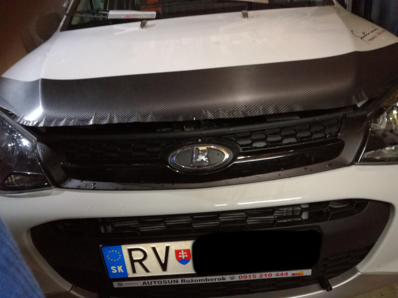 Skúsenosti zo starších mojich aut, ktorým som po každej zime musel ich predné oďobkované kapoty od skaliek zatierať farbou na špičke štetca ako dieťa keď má kiahne, som sa rozhodol našu Kalču ochrániť trochu inak. Minulý rok som to už nestihol, aj keď „karbónová“ fólia z Číny dorazila skoro, ale teplota v garáži už ani pri kúrení nešla nad 15°C a bola nevyhovujúca na lepenie fólie. Na jar sa mi podarilo v SlovLADE v Košiciach kúpiť aj deflektor na kapotu, tak bolo rozhodnuté tak či tak aplikovať fóliu a na to deflektor a to i preto, že ,kovové držiaky deflektora tak nebudú priamo na laku kapoty. Ešte uvidím čo to bude robiť za jazdy, ale minimálne ešte deň až dva fólia by nemala zmoknúť. Ono aj tak sa chystám pustiť do vystriekania zadných blatníkov a dutín Dinitrolom, tak mi to v tomto búrkovom počasí aj vyhovuje.