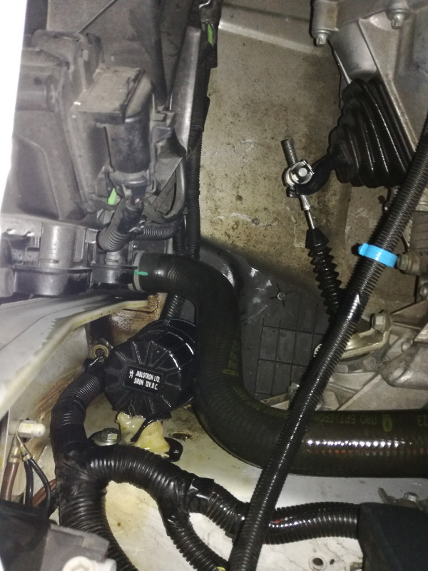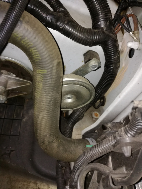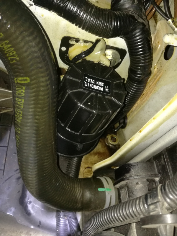 Vonku sa ochladilo a teplota v garáži klesla z 30°C na „pracovných“ 26°C a mohol som sa pustiť do malej údržby a keď už sa človek v niečom rýpe, popri tom urobiť dajaké to vylepšeníčko. Aby som sa pohodlne dostal k plastovému „vodítku“ spojkového lanka, tak som vybral celý vzduchový filter a našiel som konečne ďalší klaksón, ktorý mi podľa elektrického zapojenia stále unikal a už som sa zmieril tým, že schéma zasa klame. Klaksón tak bol okamžite vymenený za piezo sirénu.