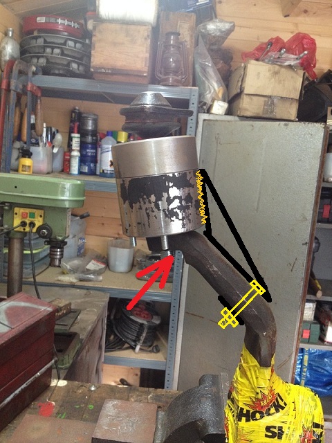 Proto mě napadlo vyrobit vzpěru z plátu ocele (černě) a k prodloužení jí přivařit (oranžově) a k těhlici jí přištoubovat dvěma šrouby. šrouby by byly vedle těhlice (na obrázky tu vypadá, jako bych chtěl do těhlice vrtat - tak ne) a fungovaly by jako objímka..