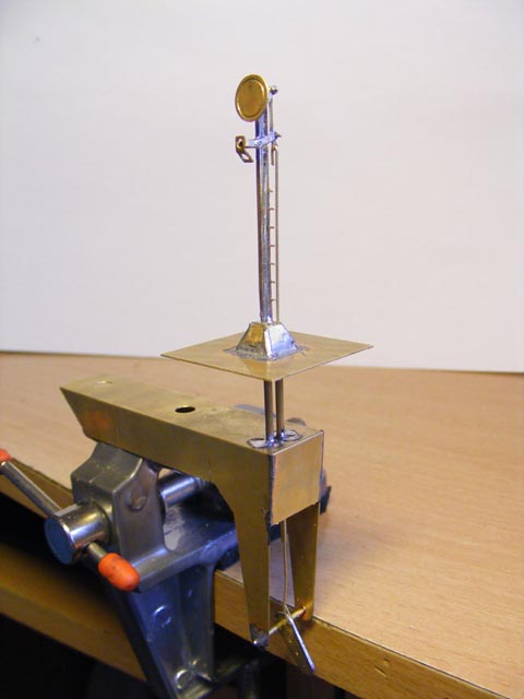 Tak se mi povedlo vyrobit leptanou stavebnici předzvěsti mechanického návěstidla. Průměr terče návěsti je 8,3 mm. Návěstidlo je plně funkční včetně osvětlení. Měřítko je 1:120.