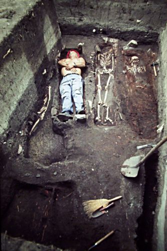 Že se dělala i sranda dokládá druhý snímek, jinak ten nebožtík s 4x holenní kostí se dostal i do novin (bez Pepy - samozřejmě :mrgreen: ). To není smontované, ale vzniklo to cca v 13.stol překopem jiného hrobu..... :rolleyes: