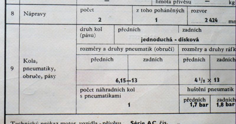 máte někdo napsáno v TP rozměr pneumatik? Já pouze plech. disk 4,15x13 a nebo 4,5x13