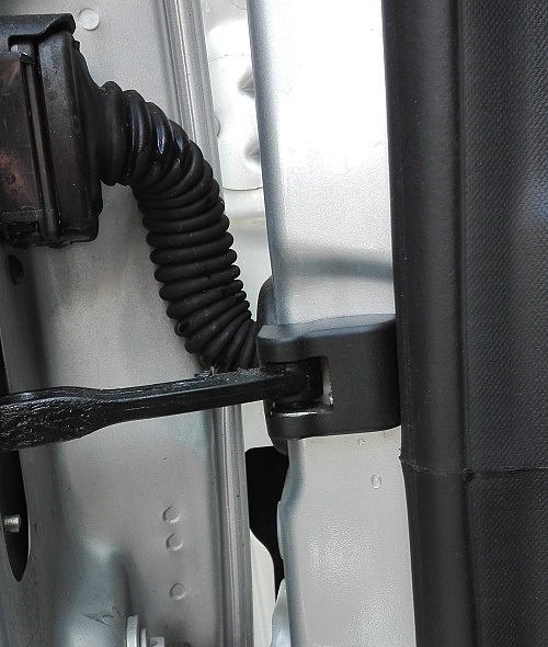 Vošla do dverí vpravo vedľa tlačidiel, tam ako vychádzajú dráty cez gumovú priechodku, o ne som ju prichytil viazacou páskou. čiže drží o dráty a tie ju pritláčajú o tu gumenú priechodku, takže by sa nemala nikde hýbať a ani klepotať o niečo.