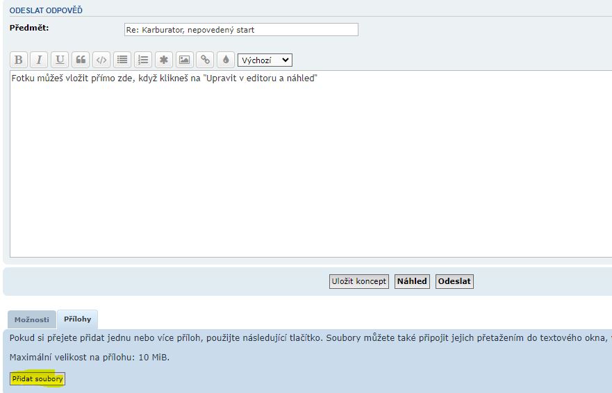 Fotku můžeš vložit přímo zde, když klikneš na "Upravit v editoru a náhled" a pak přidáš jako přílohu.