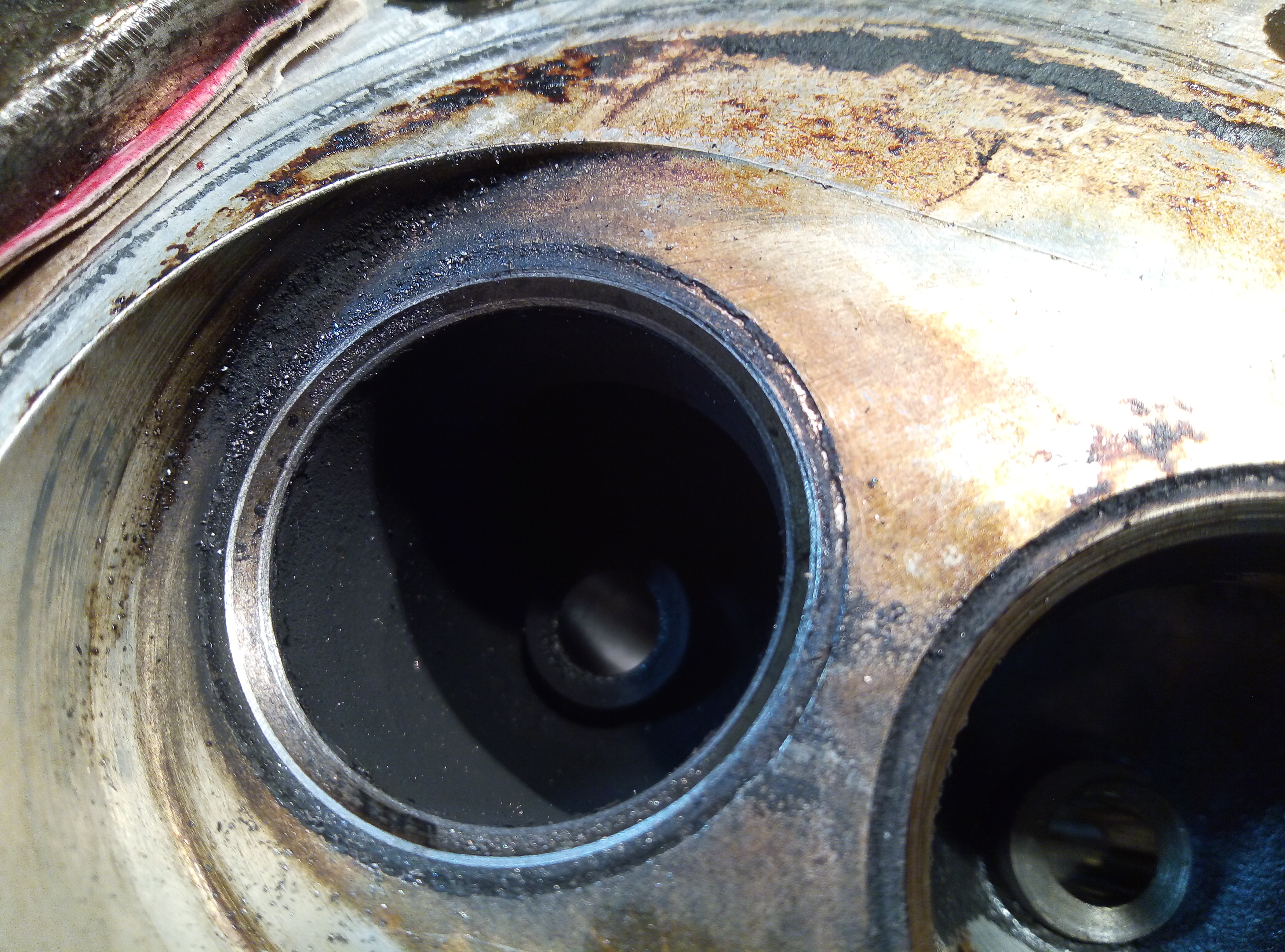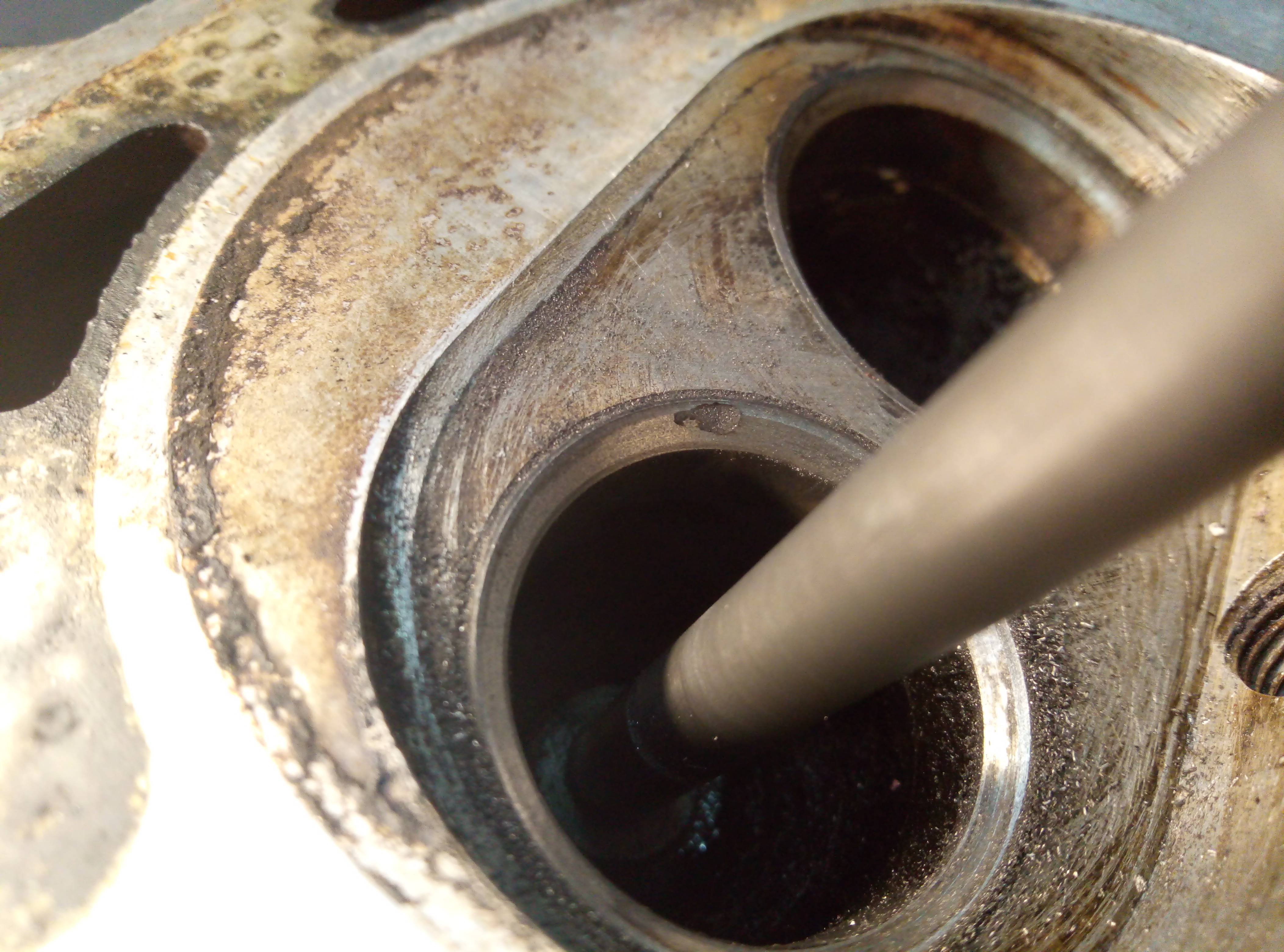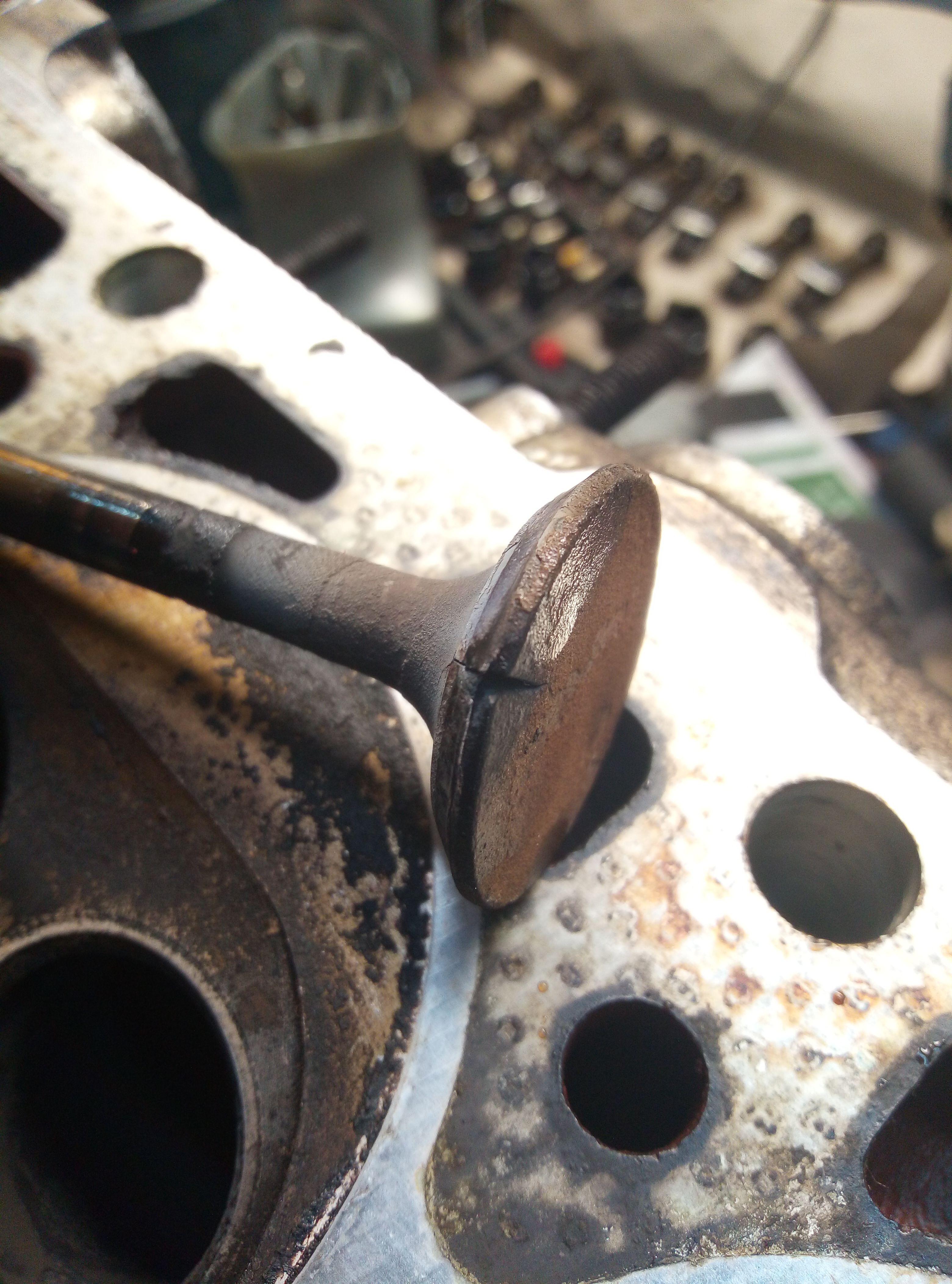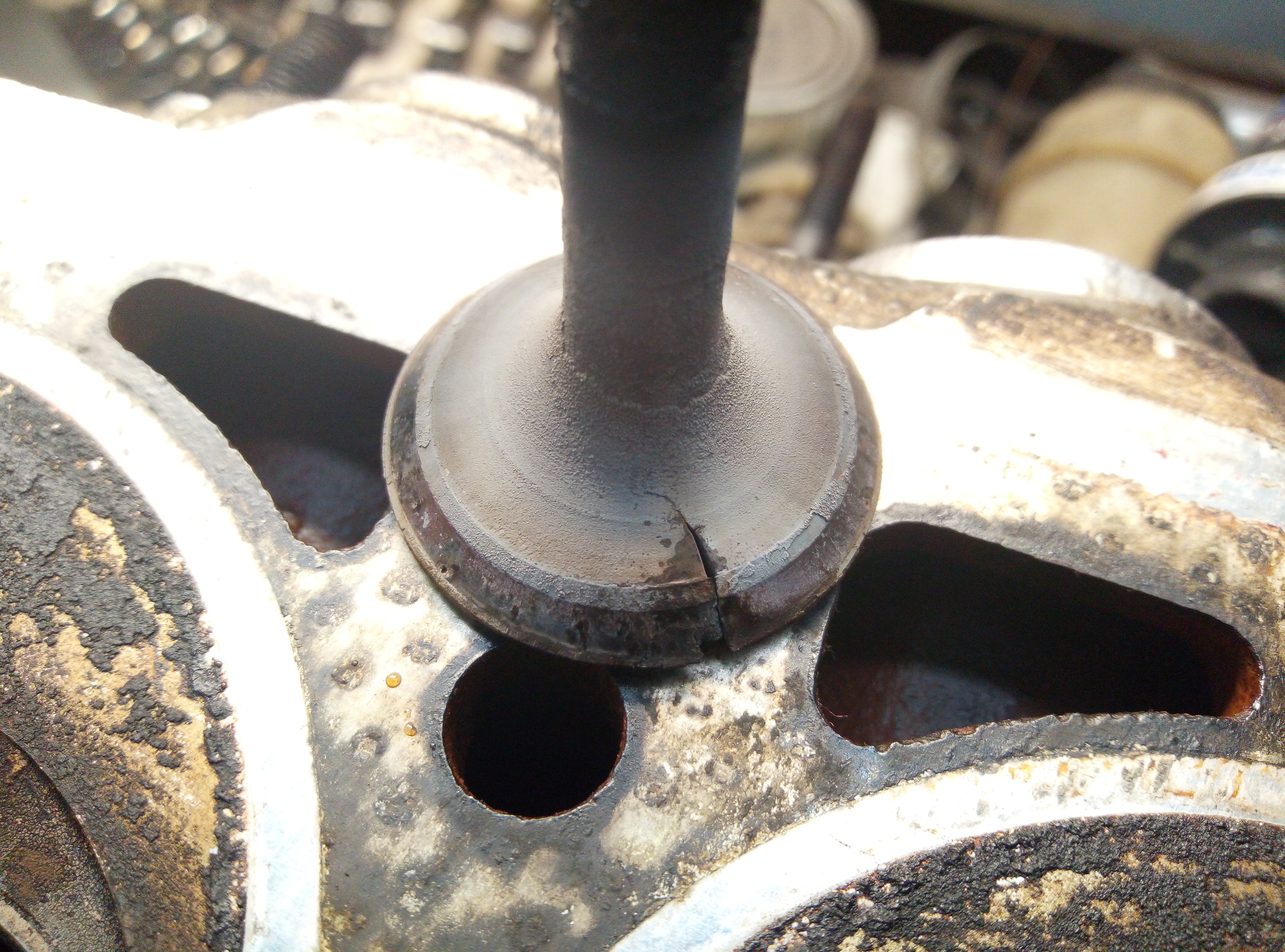 Takhle upálených ventilů jsem viděl hodně, mimo jiné i na Ladě. Nejčastější příčinou je tvrdá nečistota, která se sevře mezi ventil a sedlo. Okamžitě dojde k extrémnímu nárůstu teploty v daném místě a ventil normálně odkápne.