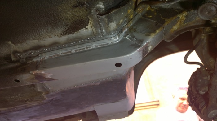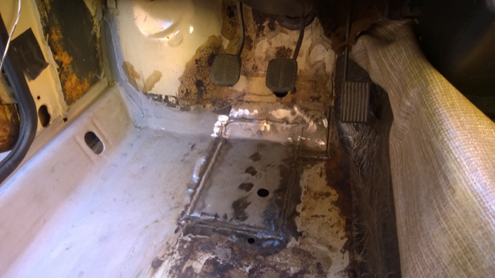 Tady už jen jak to vypadá po navaření A obroušení Momentální stav vypadá tedy takto... Pokračováním bude buď "L" profil pod podlahou spojující jí s výztuhou prahu (její spodní polovina neexistuje), pak by šel navařit příčný nosník (sekerka) a nebo se dřív pustím do opravy hrany podlahy od řidiče k zadní sedačce.