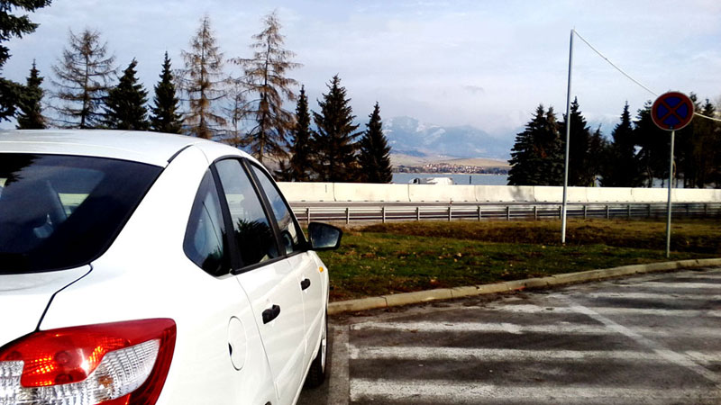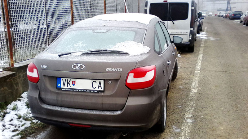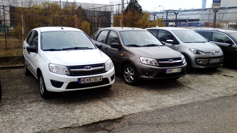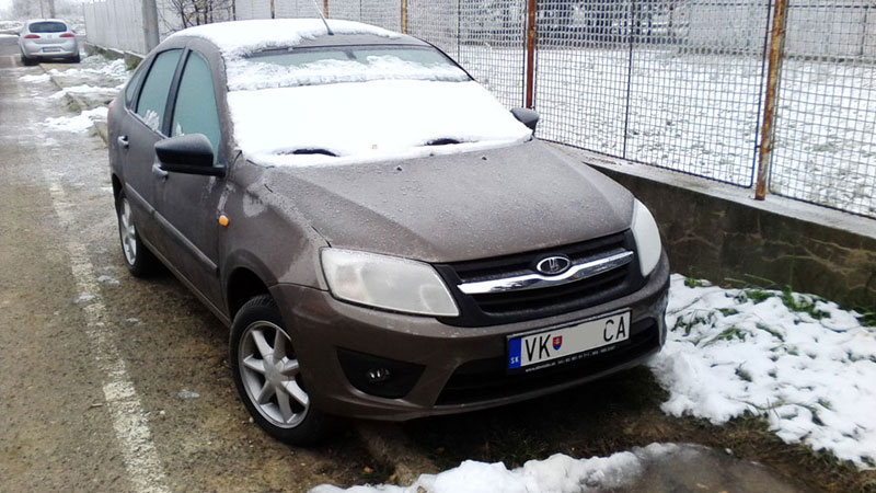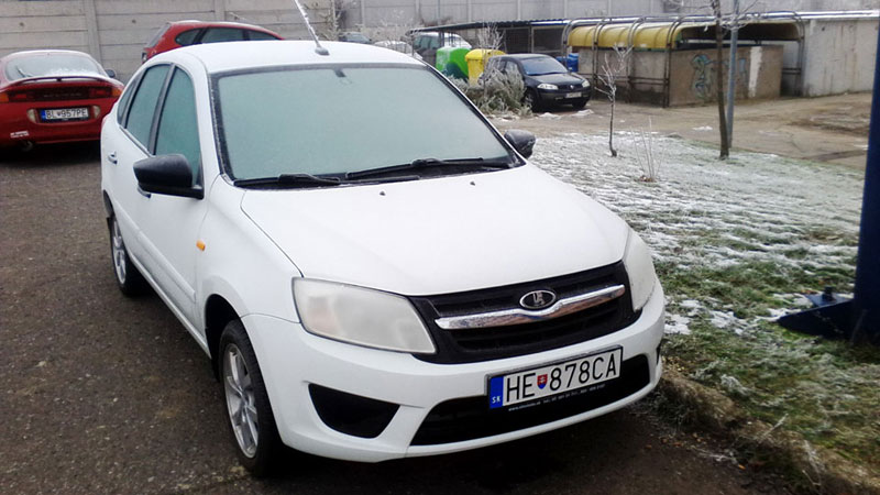 nebol najmenší problém naštartovať aj keď vozidlo stálo cca 2 týždne pre nedostatok miesta na parkovisku, ak by som sa presunul nechytím flek, ale počas víkendu sú parkoviská viac menej voľnejšie. Aké bolo moje prekvapenie keď som pri prezentácii zvedavých kolegov zazrel na druhej strane parkoviska rovnakú Ladu Grantu vo farbe koriander? Okamžite som si všimol hmlovky a iné disky kolies, pravdepodobne zimná sada, nákuk do auta cez sklo potvrdil, že sa jedná taktiež o výbavu ICE, takže viac menej podobnú verziu. Dokonca sa naskytla možnosť v jeden víkend zaparkovať pri sebe a vznikla táta milá foto minizrazu. Inú Ladu okolo som už nevidel aj keď je možné, že sa ešte niečo ukáže.