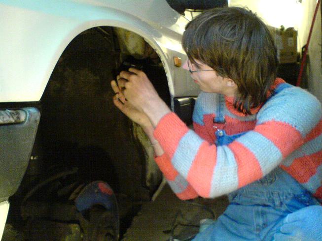 Tak trochu jsme s Peetem prozkoumávali auto a narazili jsme mimo ventilovaných kotoučů :D na tekoucí nádržku ostřikovačů a vyrezlé klobouky pérování. Tak jsme to hned opravili, ale ještě se na tom bude muset dost dělat... :x