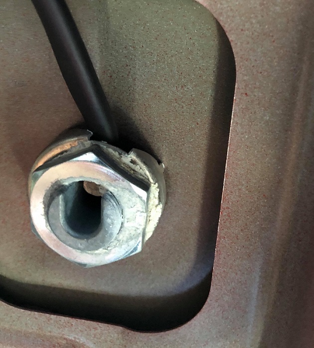 Po zložení sa mi naskytol takýto nepríjemný pohľad. Okolo skrutky bordel z oxidácie a tak isto aj na DPS. Skrutku antény som dotiahol o 3/4 otáčky aj to veľmi s citom...