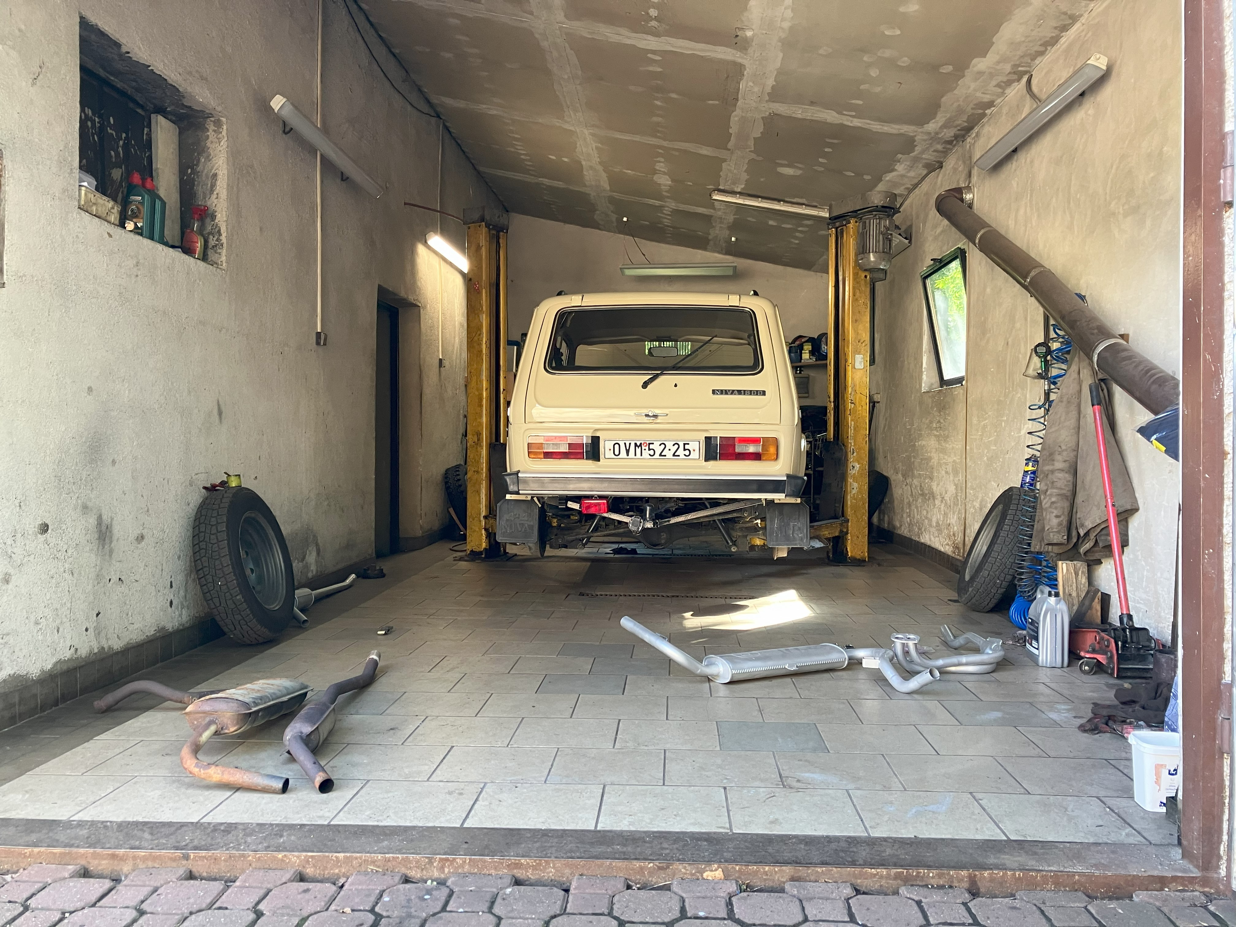 Tak výfuk je připravený na výměnu. Doufám, že se zbavím toho brumu který se ozývá poslední dobou. Krom toho jsem zjistil, že mi na sedadle řidiče upadl jeden držák toho drátového výpletu spodního sedáku. Asi mi chce Niva naznačit, že bych měl zhubnout.