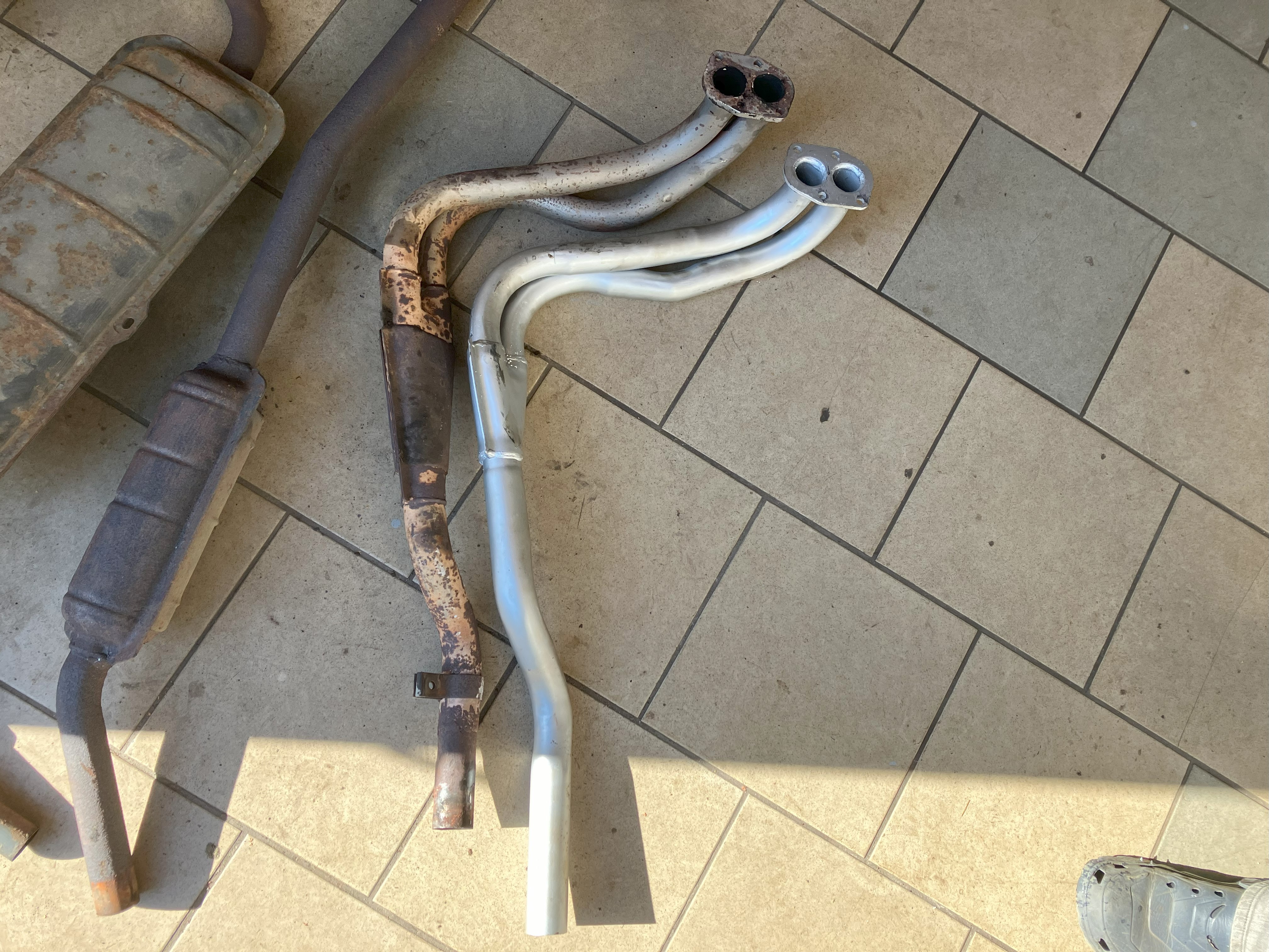 Tak výfuk je vyměněn, teda krom prvního dílu, ten nepasuje, trubka je trochu kratší od příruby k prvnímu ohybu a pak možná i směrem k tomu dalšímu svaru. . Tam kde se to spojuje do jedné trubky se to opře o motor. Nepovedlo se to namontovat ani zkušenému automechanikovi. Když už to bylo na zvedáku, tak jsem nechal vyměnit i brzdové hadice k předním třmenům. Ve starém výfuku to mírně chrastí v obou dílech, ale díry tam nejsou. Zmizely pazvuky zezadu i rezonance výfuku při plném plynu. Teď se zaměřím na rezonanci v sedadle spolujezdce