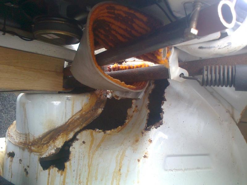 ... no, když znova koukám na fotky, po odeznění počátečního šoku ... sundat tlumič s pružinou, vyřezat co je echt rezavý, pak vzít plech, dovařit cočkem co chybí, koupit barvu ... Rust-Oleum Penetrator, což je taková šikovná základovka, co se hodí i na rez - prosakuje jí a narozdíl od Pragoprimeru dělá celkem silnou a pevnou vrstvu. Zkušenost s ní mám výbornou, navíc nerada hoří. Pak to ještě přetřeš nějakou normální syntetikou, a to auto se bude muset rozpadnout někde jinde, tady neumře ;)