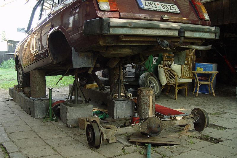 Jináč jsem se dal do repase zadku na kombíku, zase za 5 minut dvanáct. V půlce demontáže nápravy začaly definitivně téct do té doby jen vlhké palivové trubky, tlumiče jsou vyteklé, na každé pružině odlomený poslední závit, 9 z 10ti šroubů jsem musel uřezat. A jináč mrkněte, jak vypadají Polské plastové podběhy po jedné slovy jedné zimě :?