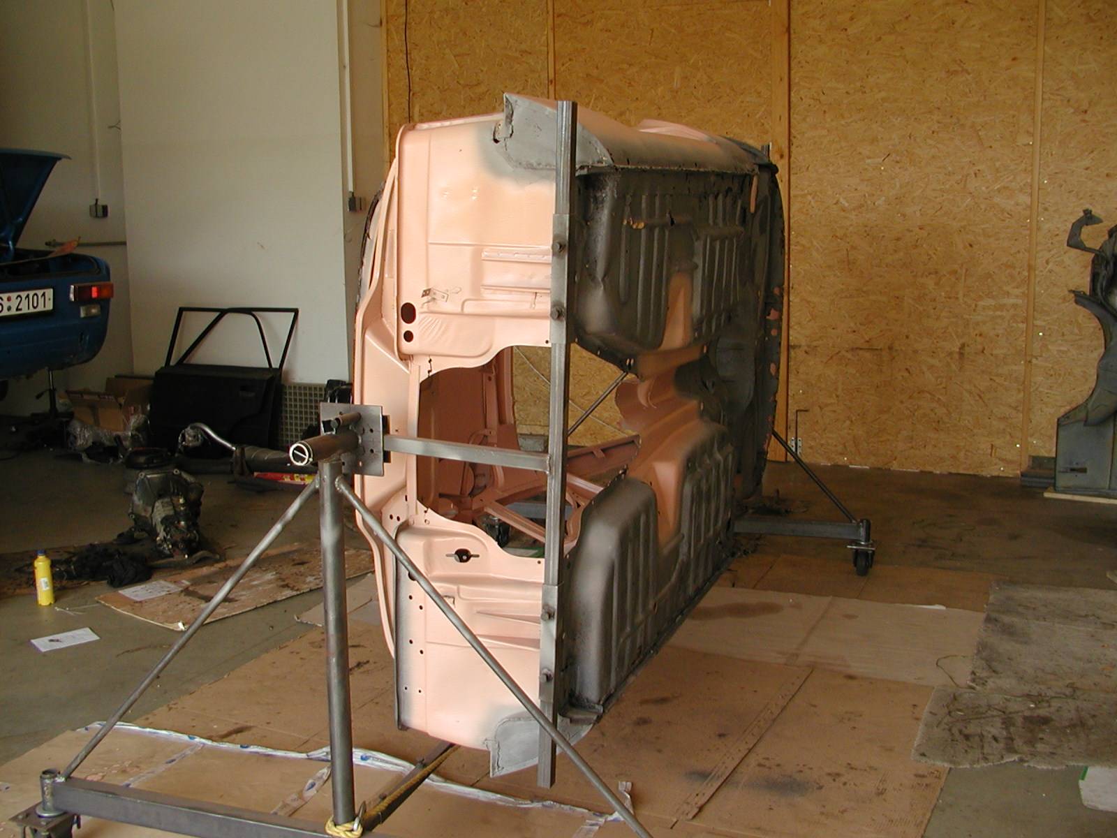 Během jara 2011 jsme posvařovali otočný rám pro upevnění karoserie, z kterého se nehnula dlouhých 5 let. Proběhlo opískování, části které nebylo nutné vyvařovat jsem ihned nalakoval dvousložkovým základovým epoxidem - růžovým