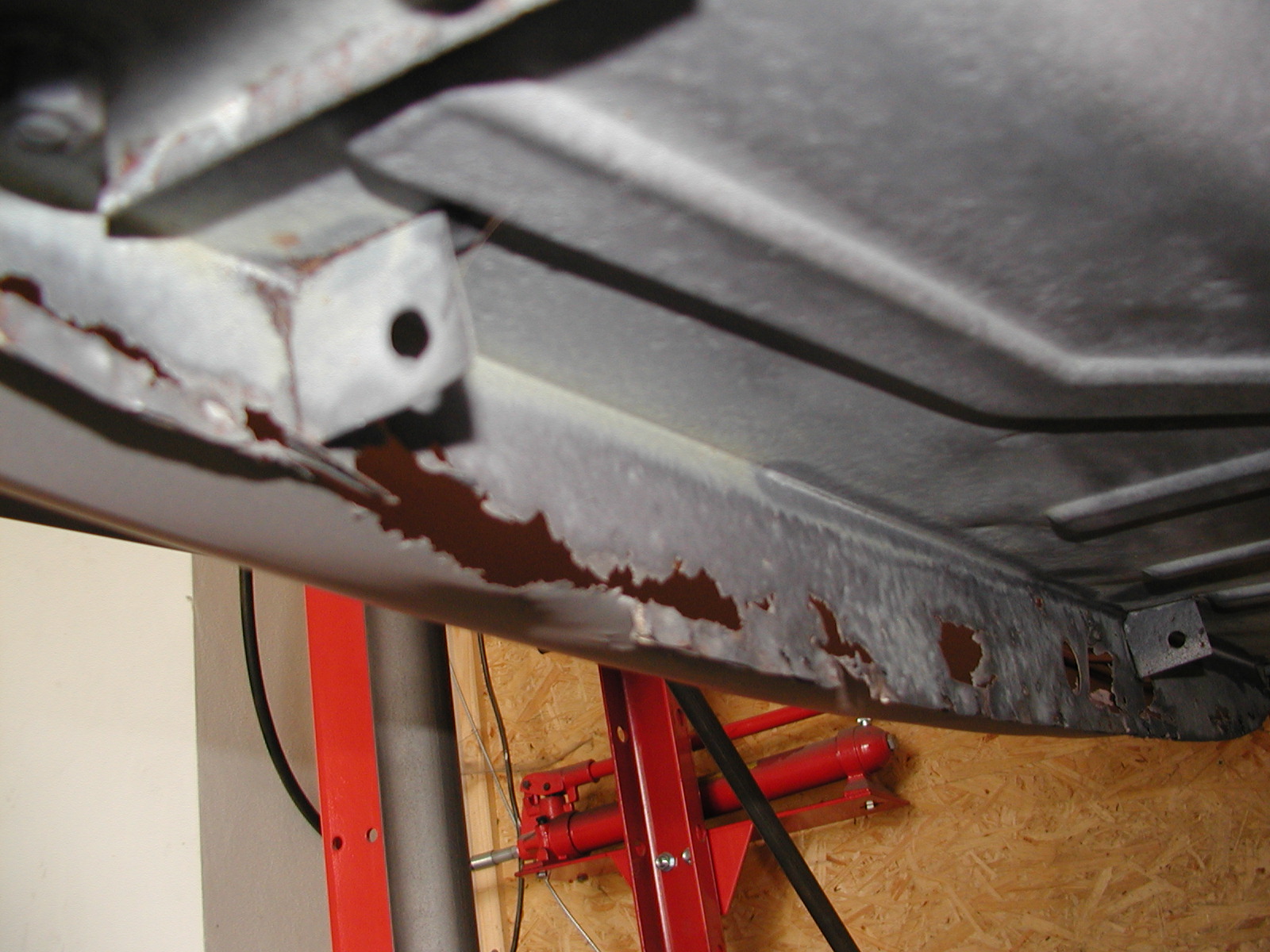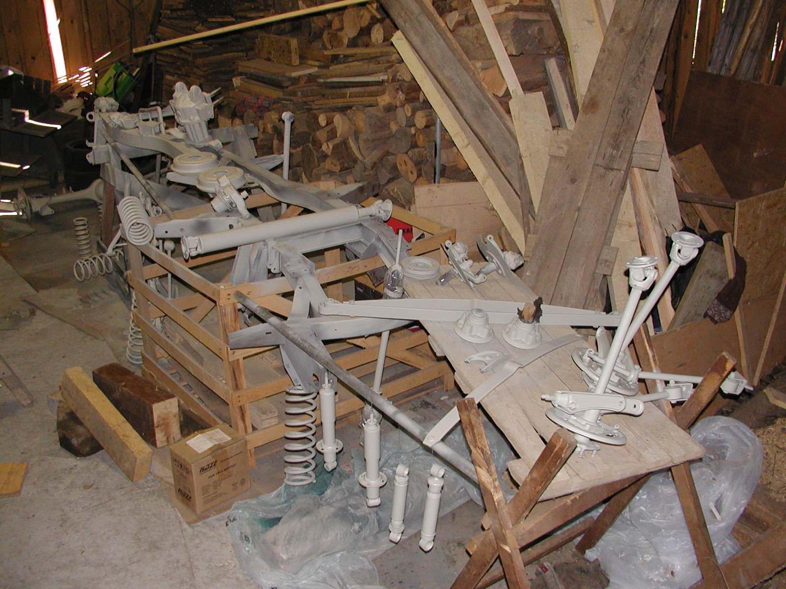 Rok 2011 je zamnou a přecházíme do roku 2012. Karoserie je po klempířské opravě, nicméně ještě není nachystaná do lakovny. Rovněž jsem nechal opískovat veškeré podvozkové díly a pustil se do lakování. Prvně epoxidový základ, následně epoxidový vrch. Tou dobou jsme ještě neměli prostor na lakování a tak jsem to všechno šmrcnul barvou hned vedle dřeva