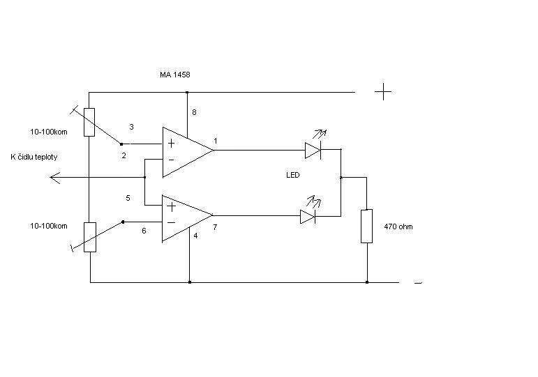 Sorry ale na to jsem zapoměl takže znovu. klidně si to postav bude to fungovat na první zapnutí ,ten IO může být jakákoliv 1458.a když k té červené LED zapojíš "samovybuzovací "bzučak (třeba KP121)tak to bude i s akustickou signalizací.