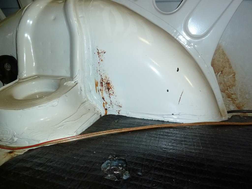 Podkova ještě ne, zvenku není nic vidět (podkova = ten plech zvenku, s prolisem, co je v něm závit na bezpečnostní pás). Doteď byla Niva "bez koroze", stříkané dutiny, spodek...