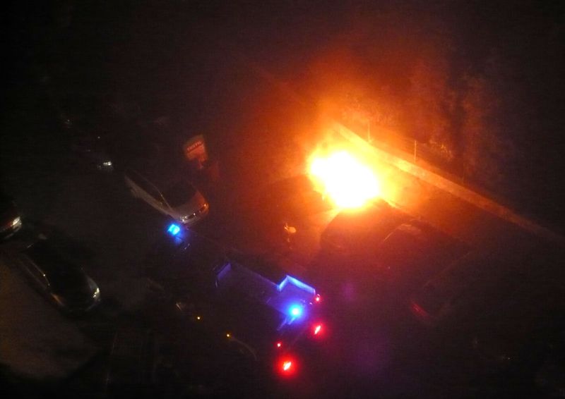 Tak se tak dívám na TV a najednou zjistím za oknem červené problikávání jako od ohně :rolleyes: První jsem se leknul, že hoří někde pode mnou :shock: Vylezu na balkon a vidím před domem hořící auto..... Hasiči dojeli, to už to odnášelo i auto vedle. K nádržím se to nestihlo dostat, tak žádný výbuch. Hořící auto ani nevím co je, to trochu hořící je sousedův korejec.