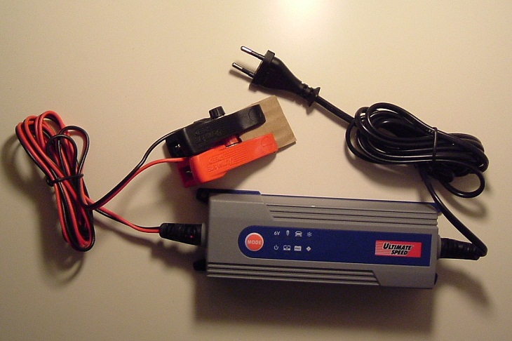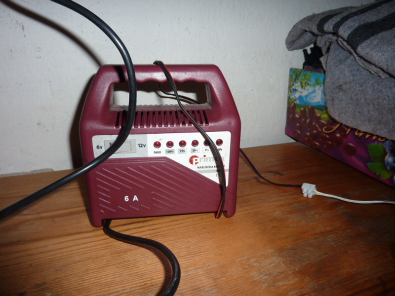Všetko je viacmenej zrejmé z foto dokumentácie. Akurát vyzdvihnem prezieravosť súdruhov zo ZSSR ktorí vybavili povoz konzolou – predpokladám, že na obdobný účel ako som ju nakoniec využil ja. Použil som starú , pre mňa z pohľadu nabíjania “prúdovo presvedčivejšiu“ (škodovácku) ešte bakelitovú zásuvku, čo predpokladám vylučuje v budúcnosti problémy s dnešnými mnohokrát nepodarenými plastovými výliskami. Ako “donabíjačku“ som použil produkt (viď. nižšie). Výraz dobíjačka nie je preklep, pretože bohužiaľ nie je schopná uspokojivo nabiť “vymlátenú“ BATT, ale na udržiavacie priebežné nočné dobíjanie je ako stvorená.