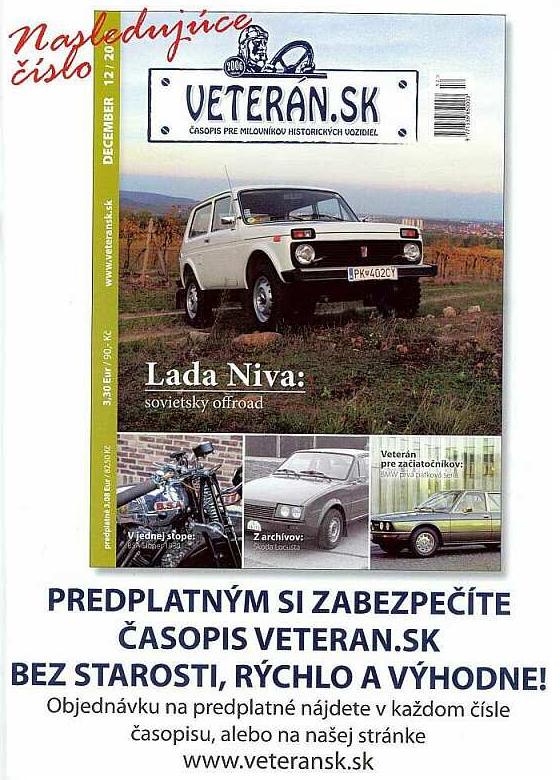 byl jsem požádán svým slovenským kamarádem a kolegou, abych na Ladafóru v Čechách uložil pár foto jeho krásné Lady NIVY, ještě původní výroby, určitě se také rádi podíváte na toto původní dnes již velmi vzácné a ojedinělé provedení. Zároveň zde pro zájemce přikládám upoutávku na slovenský časopis veterán, kde v příštím čísle 12/2012 vyjde povídání právě o této krásné NIVĚ. V minulosti již dříve v tomto časopise byly publikovány dvě lady stejného majitele - žlutobílá VAZ 2103 a červená 2101 také nádherných veteránských kvalit. Tento starší slovenský článek se souhlasem autora a vydavatelství později přiložím a dám pro potěšení oka a duše také k dispozici….